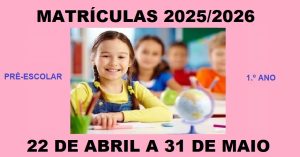 Informamos os interessados do calendário e dos procedimentos de Matrícula para a Educação Pré-Escolar e para o 1.º ano do 1.º Ciclo para o ano letivo 2025/2026. O período de matrículas decorre entre o dia 22 de abril e o dia 31 de maio obrigatoriamente no Portal das Matrículas (https://portaldasmatriculas.edu.gov.pt), com as credenciais de acesso …
