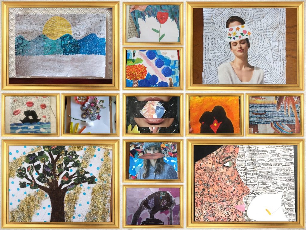 Escolher um verso de músicas previamente partilhadas e realizar uma ilustração com recurso a materiais como jornais, revistas, fotografias, livros, cadernos, rótulos de embalagens, etc, para interpretar a parte da música que cada um selecionou.