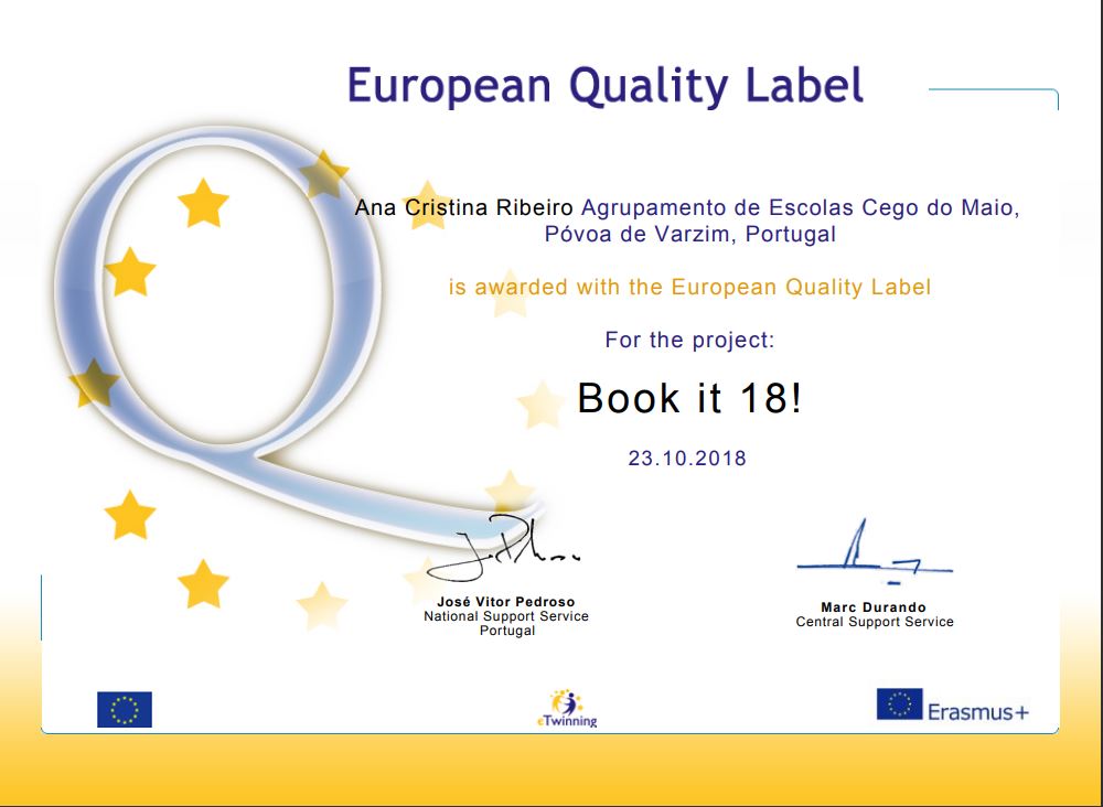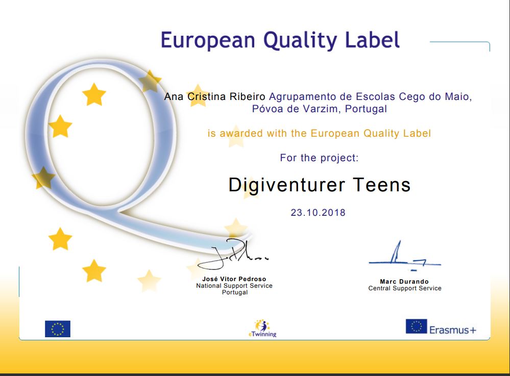 Parabéns! A sua escola foi distinguida com o Selo Europeu de Qualidade pelo excelente trabalho (…). Isto significa que o seu trabalho, o dos alunos e a sua escola obtiveram um reconhecimento ao mais alto nível europeu. – eTwinning Team