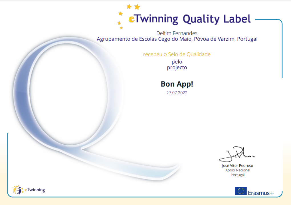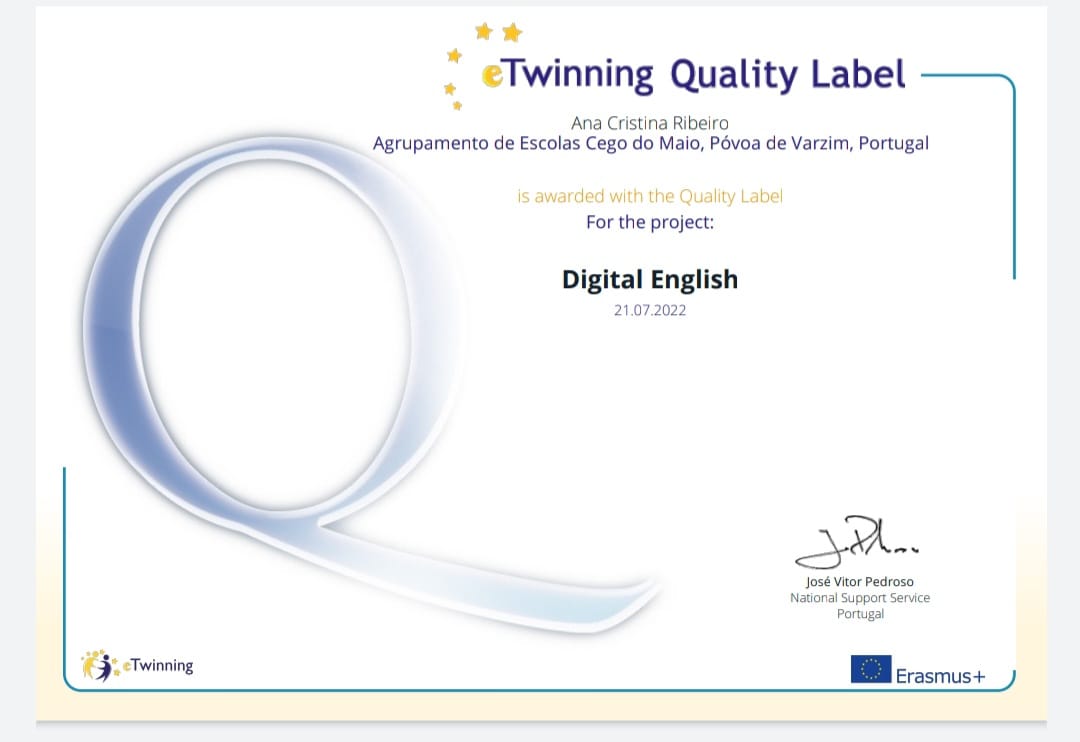 O Agrupamento de Escolas Cego do Maio foi distinguido, mais uma vez, pela Direção-Geral da Educação (DGE) e pelo Serviço Nacional de Apoio eTwinning, pela qualidade do trabalho colaborativo europeu com seis Selos de Qualidade Nacional pelo desenvolvimento de projetos eTwinning.