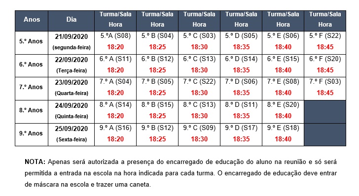 De forma a permitir um maior distanciamento para as reuniões com Encarregados de Educação dos alunos do 2.º e 3.º Ciclos procedemos a um ajustamento das horas das reuniões de forma a permitir a entrada faseada dos Encarregados de Educação na Escola.
