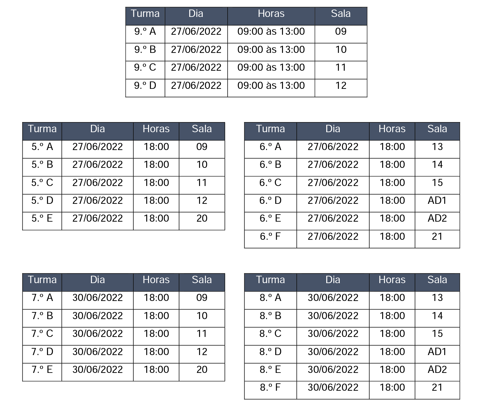 - 9.º Ano (todos os alunos) – de 27 de junho a 1 de Julho de 2022.