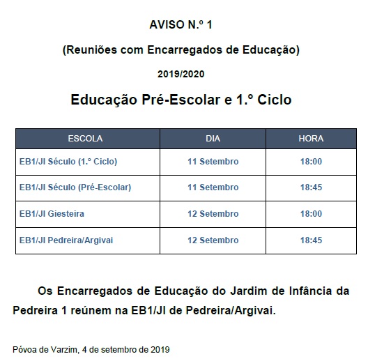Informa-se os Encarregados de Educação das crianças do Pré-escolar e dos alunos do 1.º Ciclo do Agrupamento de Escolas Cego do Maio para o calendário de reuniões com os Encarregados de Educação para a abertura do ano letivo 2019/2020, publicado no aviso n.º 1.