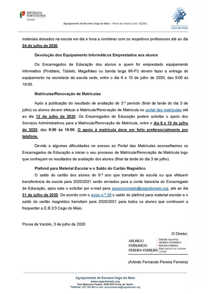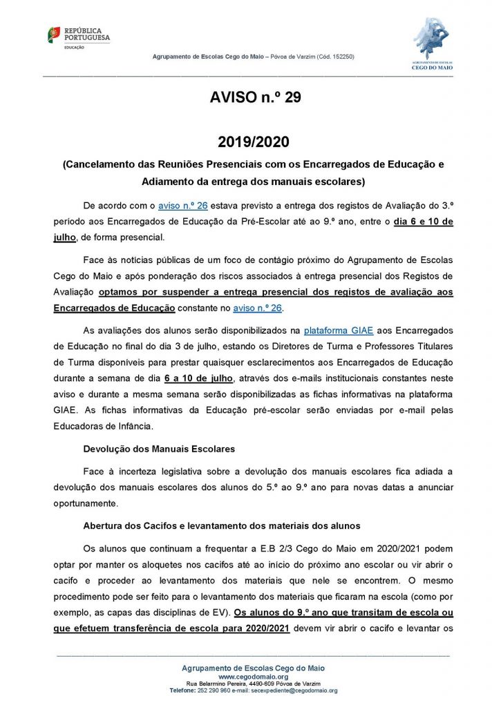Informamos os Encarregados de Educação de todos os alunos do Agrupamento de Escolas Cego do Maio que por medida de precaução, em função de um surto epidemiológico que apareceu recentemente nas imediações do nosso Agrupamento, foram canceladas as reuniões presenciais dos Diretores de Turma/Professores Titulares de Turma com os Encarregados de Educação que estariam previstas para a semana de 6 a 10 de julho.