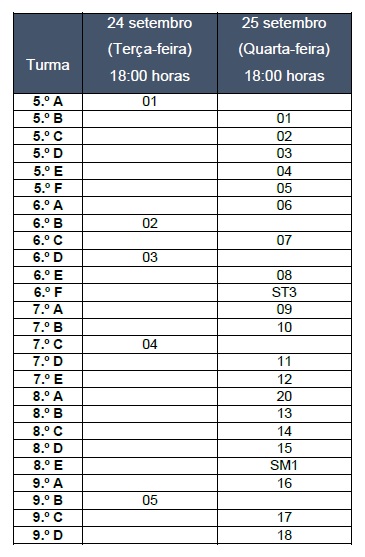 Todas as reuniões têm início às 18 horas e serão feitas nos dias 24 e 25 de setembro de acordo com a distribuição das turmas pelos dois dias. No quadro seguinte estão indicadas as salas das reuniões.