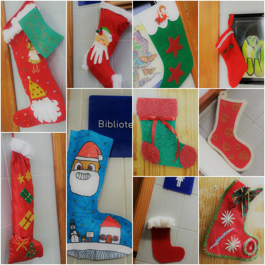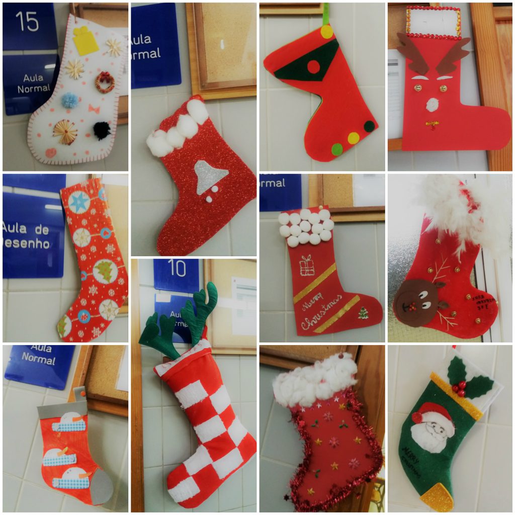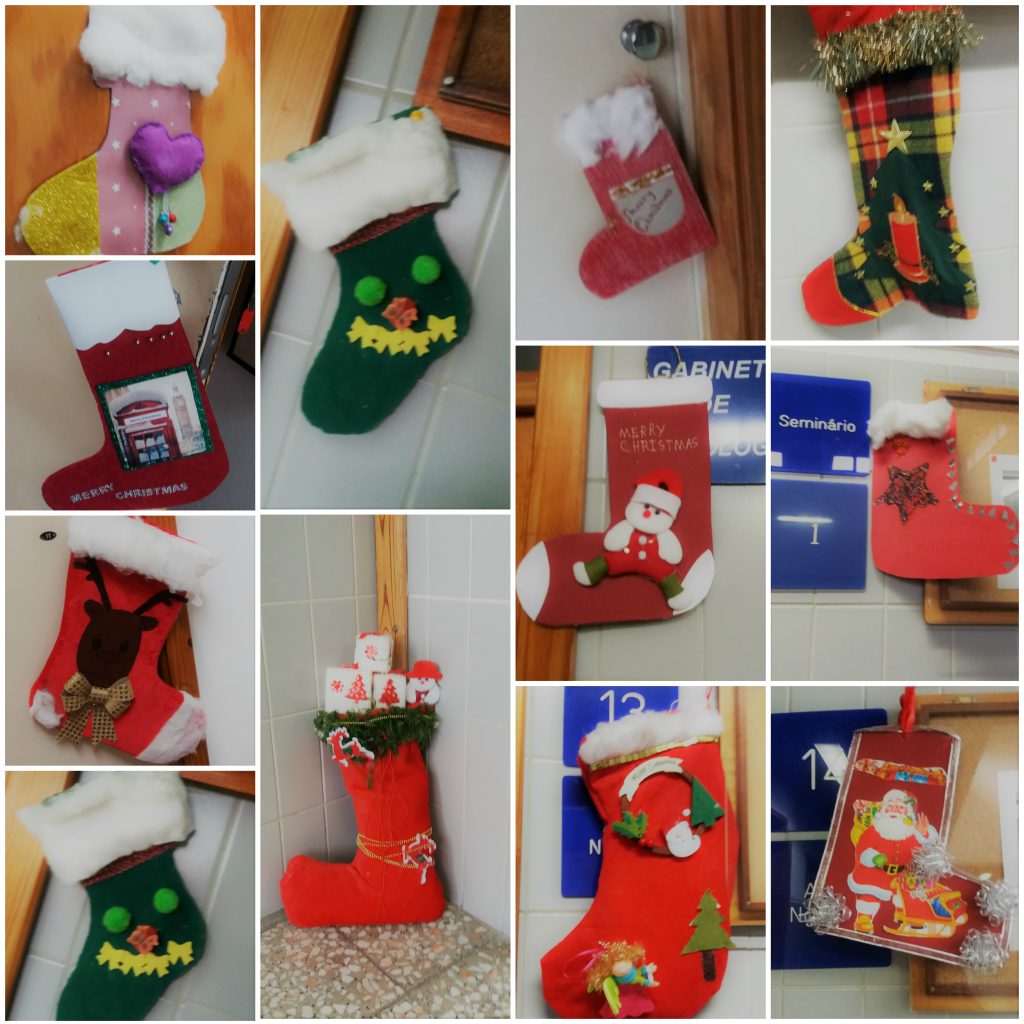 No âmbito da disciplina de Inglês, como é hábito, os alunos aprendem algumas tradições natalícias dos países de língua inglesa. Este ano foi proposto que realizassem trabalhos com o tema “Christmas Stockings” – as tradicionais meias de Natal. Todas as portas da escola foram decoradas com uma meia. Se na tradição, estas são penduradas na lareira na véspera de Natal para serem recheadas com pequenos presentes, talvez estas nas portas das salas aguardem os bons resultados…