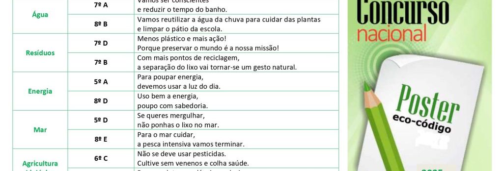 No âmbito do Eco-Clube / Programa Eco-Escolas, todas as turmas da escola E.B. 2,3 Cego do Maio foram desafiadas a participar no Concurso Eco-Código. O Eco-Código é uma declaração de objetivos traduzidos por ações concretas que todos os membros da escola devem seguir. As turmas elaboraram duas frases para cada tema – água, resíduos, energia, … Continue a ler Concurso Eco-Código 2025 – Frases vencedoras