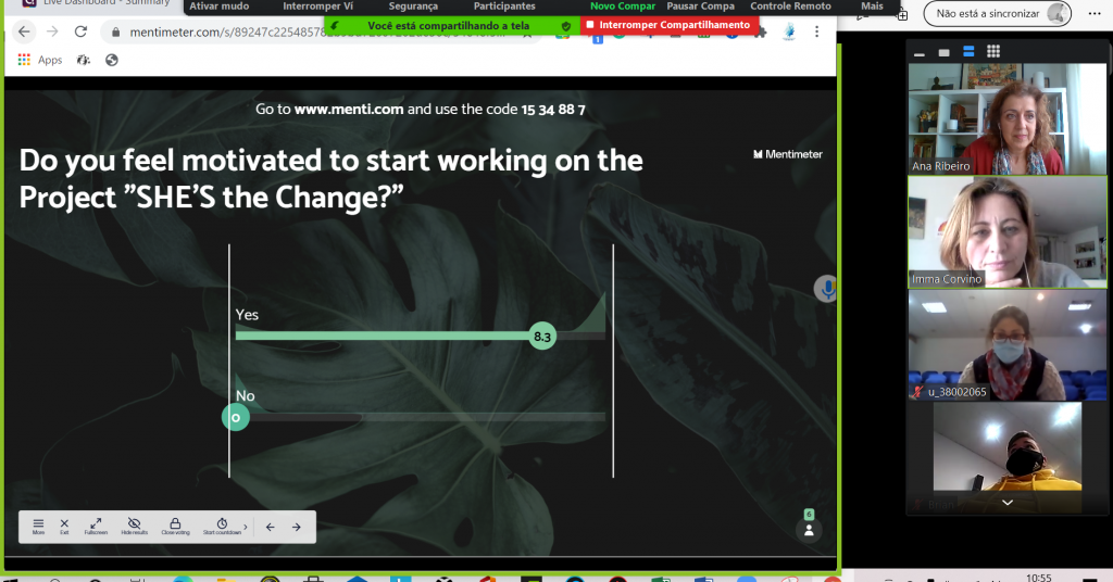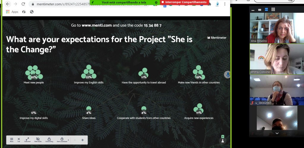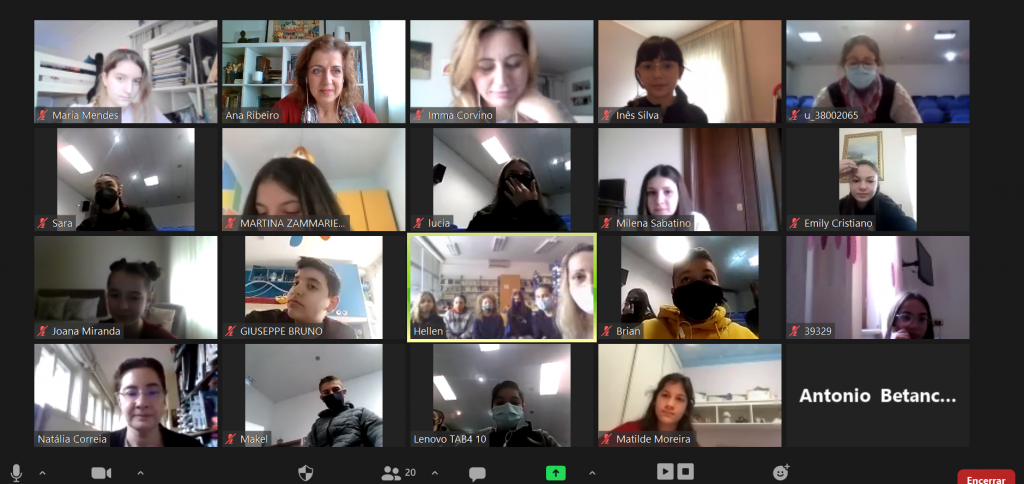 Na passada quinta-feira, dia 4 de março, reuniram-se via Zoom, alunos e professores dos quatro países parceiros do projeto Erasmus+/eTwinning “SHE’S the Change”. Os alunos da escola IES San Marcos, Tenerife (ilhas Canárias) , Espanha e de 4th High School of Volos, Grécia, juntaram-se à conferência a partir da escola, enquanto os alunos italianos do Istituto comprensivo Luca Tozzi, Frignano e os alunos da EB 2,3 Cego do Maio participaram a partir de casa, uma vez que, em ambas as escolas, o ensino está a ser realizado a distância.