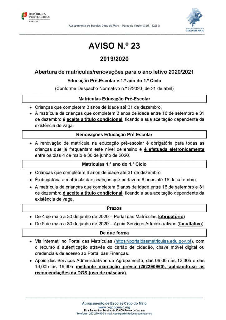 Informamos que foi publicado hoje o Aviso n.º 23 que procede à abertura das matrículas, com início no dia 4 de maio e término no dia 30 de junho para o ingresso das crianças na Educação Pré-Escolar e no 1.º ano do 1.º Ciclo para o ano letivo 2020/2021 no Agrupamento de Escolas Cego do Maio.