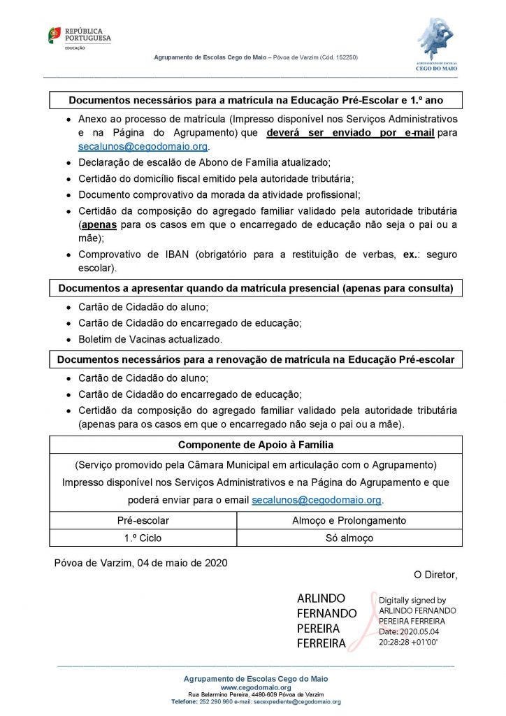 A acompanhar a matrícula eletrónica os Encarregados de Educação devem preencher um dos seguintes documentos, conforme se trate de uma matrícula na Educação Pré-Escolar ou de uma matrícula no 1.º ano do 1.º Ciclo. Estes documentos são em PDF editáveis, não necessitando de ser impressos e deve ser enviado por e-mail para [email protected]