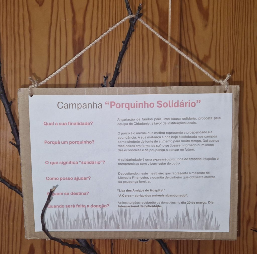 A campanha “Porquinho Solidário”, a decorrer na Escola Básica Cego do Maio, enquadra-se numa das dimensões da Cidadania – Literacia Financeira. 💰📚
