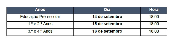 Na próxima semana será afixado em todas as escolas do 1.º ciclo e pré-escolar o Aviso n.º 2, com o calendário das reuniões com os Encarregados de Educação da Educação Pré-escolar e do 1.º ciclo.