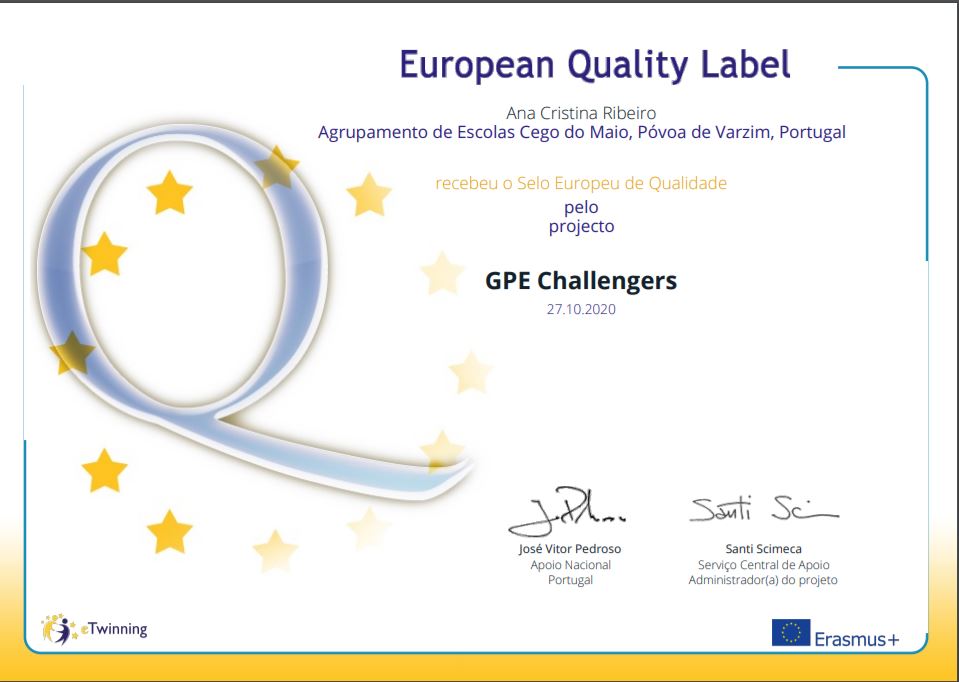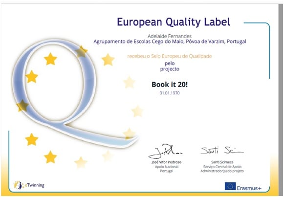 Passaram mais uma vez de reconhecimento nacional, a distinção europeia os três projetos eTwinning desenvolvidos no ano letivo 2019/20 no nosso Agrupamento pelas professoras Adelaide Fernandes e Ana Ribeiro. As professoras foram distinguidas com três Selos Europeus de Qualidade eTwinning pela dinamização dos projetos “Book it 20”, com a participação dos alunos do 6.ºE no âmbito da disciplina de Português, “S.P.A.C.E”, integrado no currículo da disciplina de Inglês da Turma XXI, e “GPE Challengers”, com a participação de toda a turma do 7.ºE na disciplina de Inglês, Cidadania e Projeto+, integrando os 324 selos atribuídos a professores portugueses.
