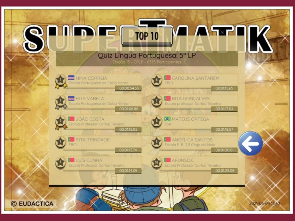 Parabéns à aluna Angélica Santos, do 5.º E que, entre 6375 participantes, ficou no Top 10 de Língua Portuguesa, concurso Supertmatik – campeonatos escolares 2020/21.