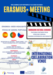 De 20 a 24 de outubro de 2025, a EB 2,3 Cego do Maio recebeu seis alunos da República Checa e cinco de Espanha, acompanhados pelos respetivos professores, para uma semana inesquecível no âmbito do projeto Erasmus+ deste ano – “CONNECT – Culture, Nature, Education, Creativity, Teamwork”.